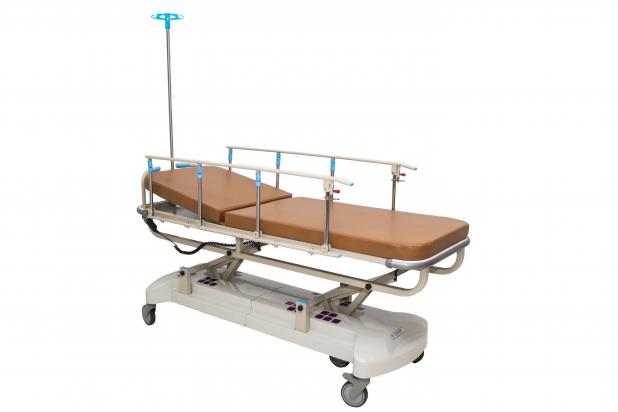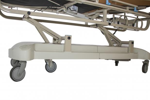 Camilla para traslado de pacientes de fácil manejo con quiebre de cabecera y regulacion en altura a traves de motor a batería eléctrica.