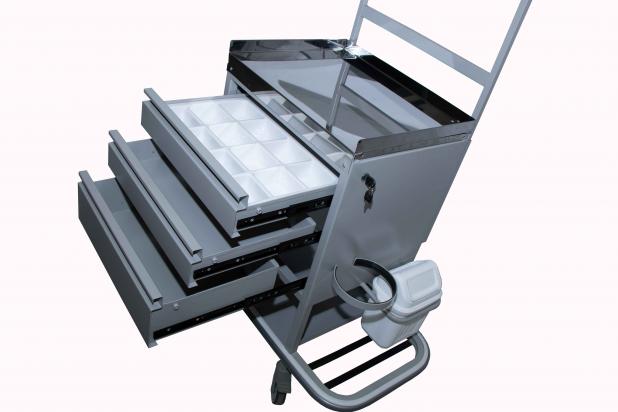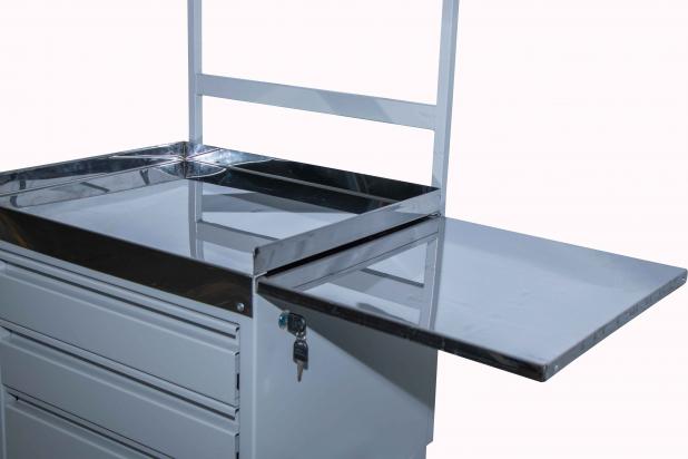 - Posee tres (3) cajones metálicos con manija, montados sobre guías de cajón con rulemanes, tope de salida y antivuelco. Uno de ellos tiene divisores plásticos lavables.