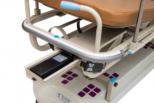 Camilla para traslado de pacientes de fácil manejo con quiebre de cabecera y regulacion en altura a traves de motor a batería eléctrica.