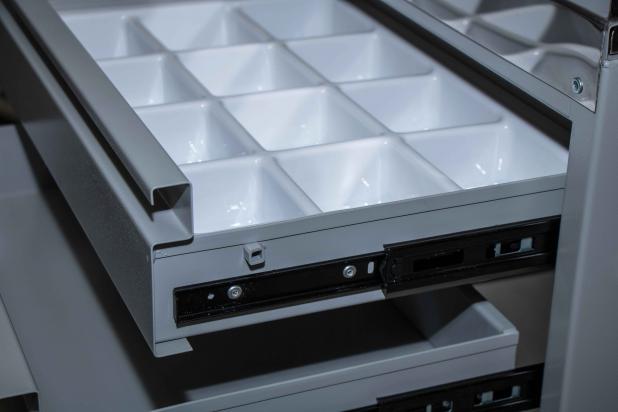 - Posee tres (3) cajones metálicos con manija, montados sobre guías de cajón con rulemanes, tope de salida y antivuelco. Uno de ellos tiene divisores plásticos lavables.